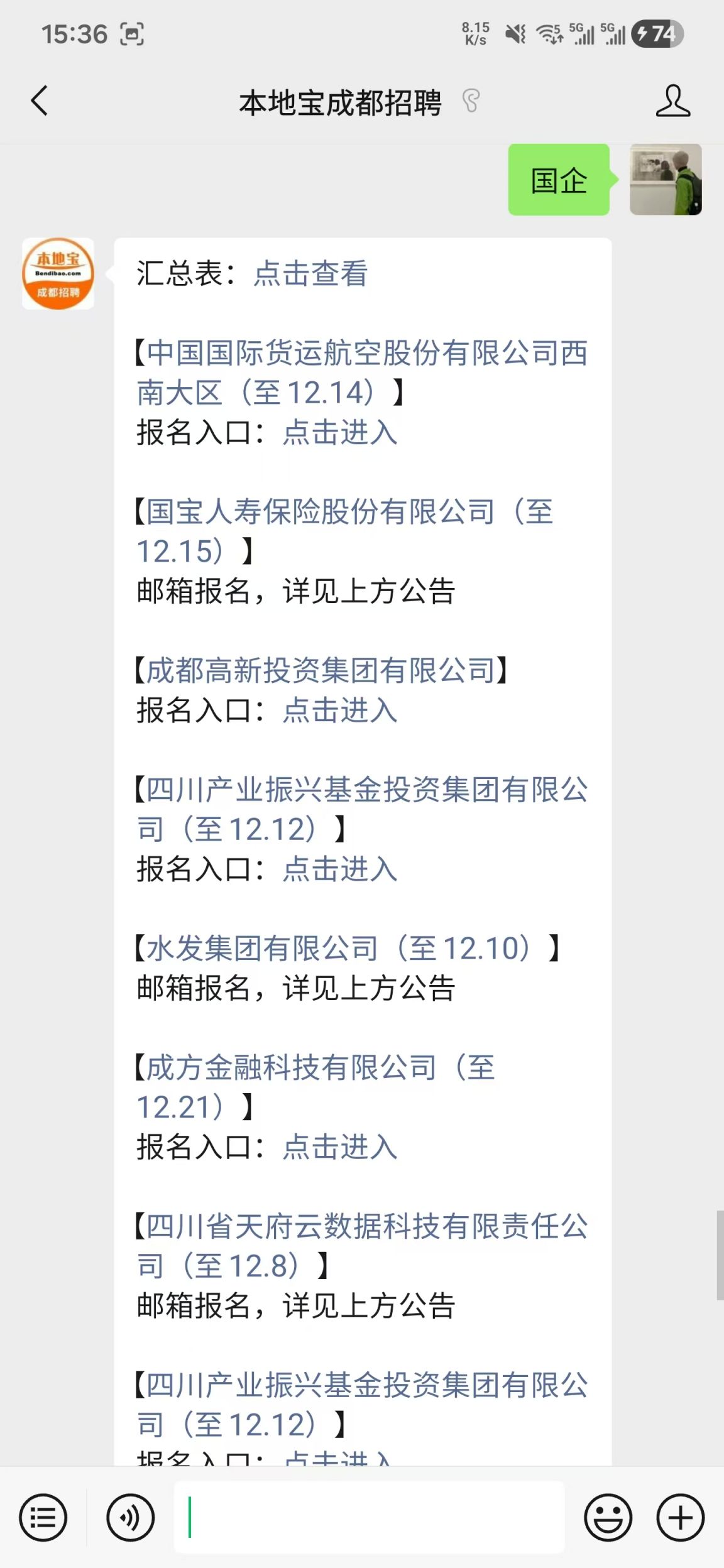 温馨提示:微信搜索公众号【本地宝成都招聘】,关注后在对话框回复【国企】即可查看成都及周边城市国企招聘息汇总、招聘公告和岗位、报名时间、报名入口等信息!