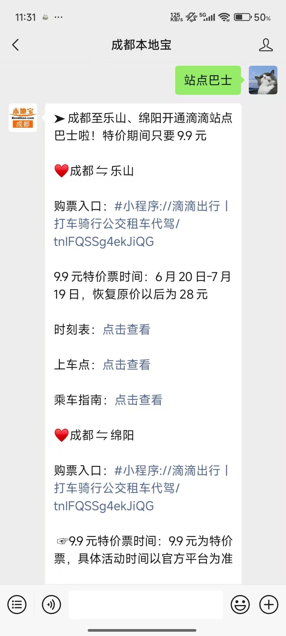 温馨提示:微信搜索公众号【成都本地宝】,关注后在对话框回复【站点巴士】,即可查看成都到乐山、绵阳等城市站点巴士乘车指南、线上购票入口、时刻表、乘车点等。