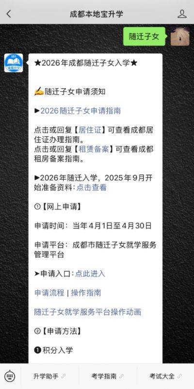 ,关注后回复【随迁子女】,即可查看2026年成都市随迁子女申请时间、入口,查询各区随迁子女申请规定和材料准备,操作指南等最新消息。