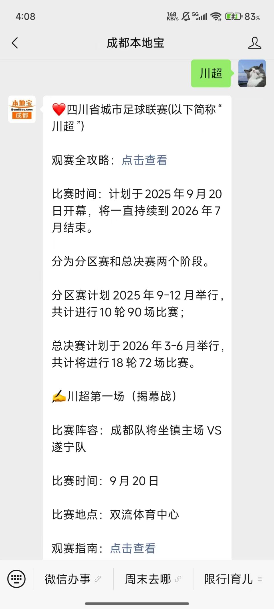 温馨提示:长按上方二维码关注【成都本地宝】微信公众号,在聊天框发送对应关键词即可获取相关旅游和活动查询入口及攻略,如回复【川超】直达2025川超购票入口,各赛区赛程表、各个地区参赛球员名单、比赛指南包括时间、地点、比赛赛区、比赛直播等更多详情持续更新中