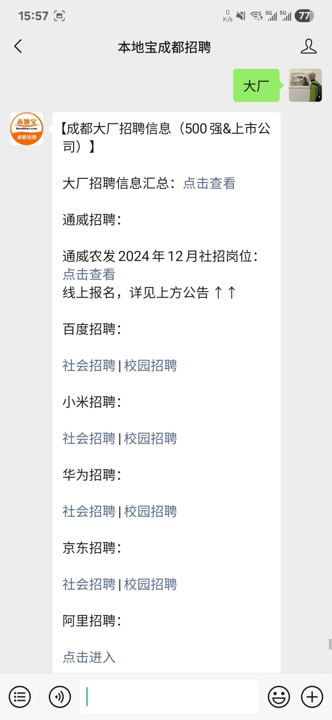 温馨提示:识别上方二维码关注【本地宝成都招聘】公众号,关注后在对话框回复【大厂】即可查看成都各大厂(小米、华为、苹果等)最新招聘岗位、校招、社招的报名入口等