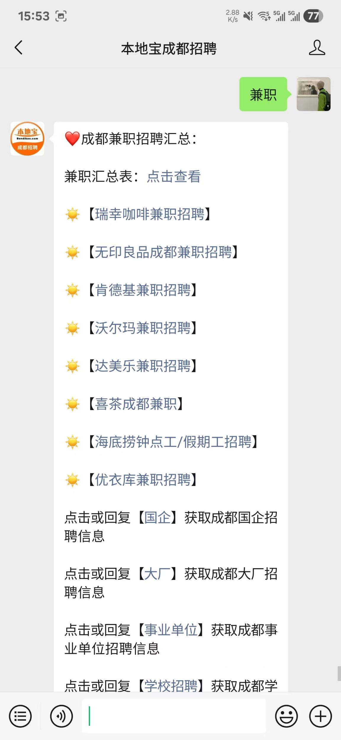 温馨提示:识别上方二维码关注【本地宝成都招聘】公众号,关注后在对话框回复【兼职】即可查看成都最新兼职(瑞幸、达美乐、沃尔玛等)招聘信息、岗位详情、报名入口等。