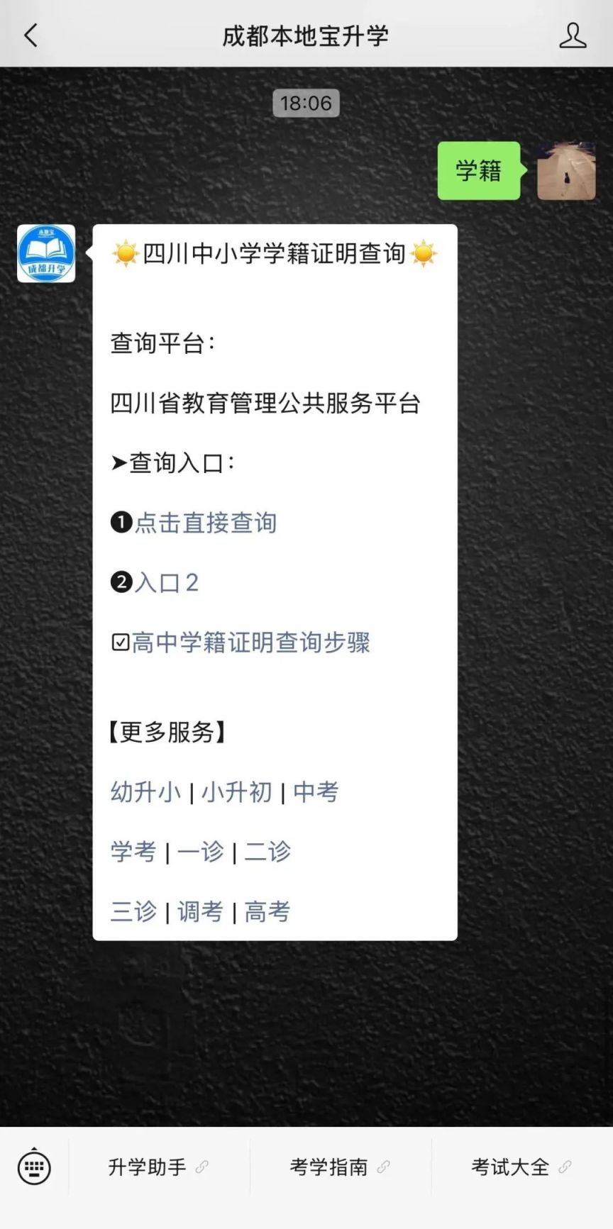 温馨提示:微信搜索公众号【成都本地宝升学】,关注后回复【学籍】即可进入四川中小学生查询入口,查看查询步骤!